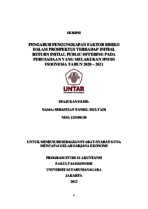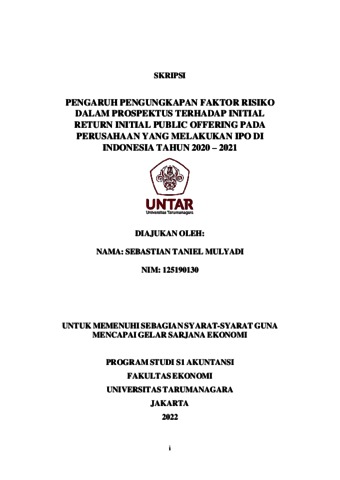 Taniel, Sebastian (2022) PENGARUH PENGUNGKAPAN FAKTOR RISIKO DALAM PROSPEKTUS TERHADAP INITIAL RETURN INITIAL PUBLIC OFFERING PADA PERUSAHAAN YANG MELAKUKAN IPO DI INDONESIA TAHUN 2020 – 2021. Skripsi thesis, Universitas Tarumanagara.