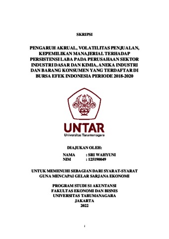 Wahyuni, Sri (2022) PENGARUH AKRUAL, VOLATILITAS PENJUALAN, KEPEMILIKAN MANAJERIAL TERHADAP PERSISTENSI LABA PADA PERUSAHAAN SEKTOR INDUSTRI DASAR DAN KIMIA, ANEKA INDUSTRI DAN BARANG KONSUMEN YANG TERDAFTAR DI BURSA EFEK INDONESIA PERIODE 2018-2020. Skripsi thesis, Universitas Tarumanagara.
