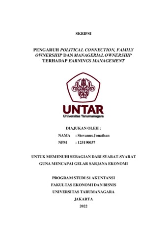 Jonathan, Stevanus (2022) PENGARUH POLITICAL CONNECTION, FAMILY OWNERSHIP DAN MANAGERIAL OWNERSHIP TERHADAP EARNINGS MANAGEMENT. Skripsi thesis, Universitas Tarumanagara.