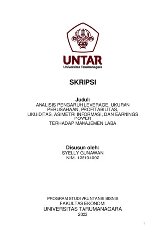 Gunawan, Syelly (2023) ANALISIS PENGARUH LEVERAGE, UKURAN PERUSAHAAN, PROFITABILITAS, LIKUIDITAS, ASIMETRI INFORMASI, DAN EARNINGS POWER TERHADAP MANAJEMEN LABA. Skripsi thesis, Universitas Tarumanagara.