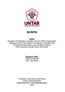 Christie, Tiara (2023) Pengaruh Profitabilitas, Likuiditas, Struktur Modal, Kepemilikan Institusional, dan Pertumbuhan Perusahaan Terhadap Nilai Perusahaan Manufaktur yang Terdaftar di Bursa Efek Indonesia Periode Tahun 2018-2020. Skripsi thesis, Universitas Tarumanagara.