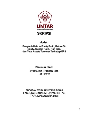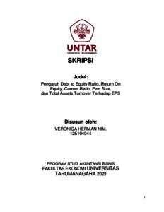 Herman, Veronica (2023) PENGARUH DEBT TO EQUITY RATIO, RETURN ON EQUITY, CURRENT RATIO, FIRM SIZE, DAN TOTAL ASSETS TURNOVER TERHADAP EARNING PER SHARE. Skripsi thesis, Universitas Tarumanagara.