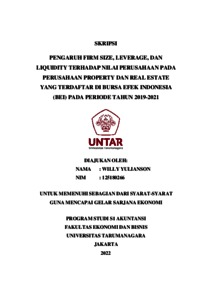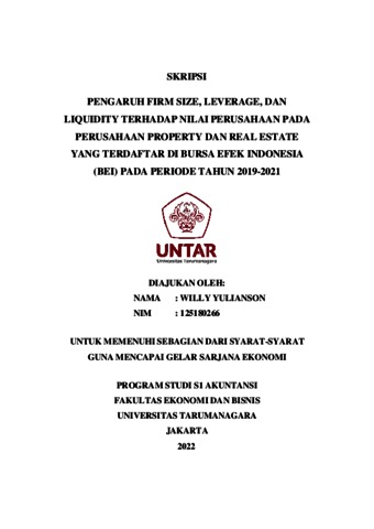 Yulianson, Willy (2022) PENGARUH FIRM SIZE, LEVERAGE, DAN LIQUIDITY TERHADAP NILAI PERUSAHAAN PADA PERUSAHAAN PROPERTY DAN REAL ESTATE YANG TERDAFTAR DI BURSA EFEK INDONESIA (BEI) PADA PERIODE TAHUN 2019-2021. Skripsi thesis, Universitas Tarumanagara.