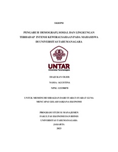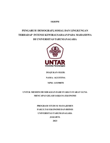 Agustina, Agustina (2023) PENGARUH DEMOGRAFI, SOSIAL DAN LINGKUNGAN TERHADAP INTENSI KEWIRAUSAHAAN PADA MAHASISWA DI UNIVERSITAS TARUMANAGARA. Skripsi thesis, Universitas Tarumanagara.