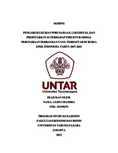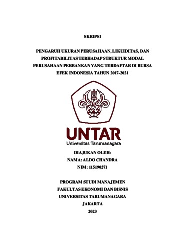 Chandra, Aldo (2023) PENGARUH UKURAN PERUSAHAAN, LIKUIDITAS, DAN PROFITABILITAS TERHADAP STRUKTUR MODAL PERUSAHAAN PERBANKAN YANG TERDAFTAR DI BURSA EFEK INDONESIA TAHUN 2017-2021. Skripsi thesis, Universitas Tarumanagara.