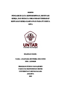 Devindra, Anastasia (2023) PENGARUH GAYA KEPEMIMPINAN, MOTIVASI KERJA, DAN BUDAYA ORGANISASI TERHADAP KEPUASAN KERJA KARYAWAN PADA PT SURYA GITA. Skripsi thesis, Universitas Tarumanagara.