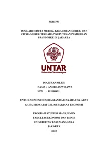 Wibawa, Andreas (2022) PENGARUH DUTA MEREK, KESADARAN MEREK DAN CITRA MEREK TERHADAP KEPUTUSAN PEMBELIAN BRAND NIKE DI JAKARTA. Skripsi thesis, Universitas Tarumanagara.