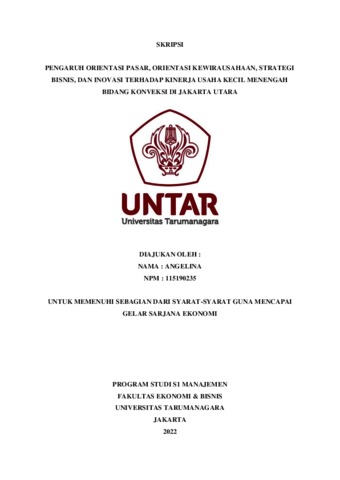 Angelina, Angelina (2022) PENGARUH ORIENTASI PASAR, ORIENTASI KEWIRAUSAHAAN, STRATEGI BISNIS, DAN INOVASI TERHADAP KINERJA USAHA KECIL MENENGAH BIDANG KONVEKSI DI JAKARTA UTARA. Skripsi thesis, Universitas Tarumanagara.