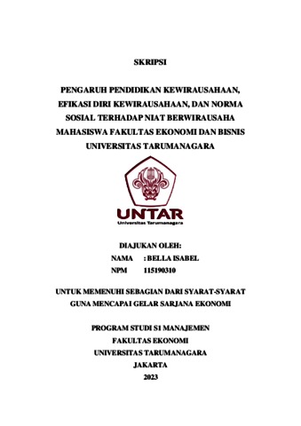 Isabel, Bella (2023) PENGARUH PENDIDIKAN KEWIRAUSAHAAN, EFIKASI DIRI KEWIRAUSAHAAN, DAN NORMA SOSIAL T ERHADAP NIAT BERWIRAUSAHA MAHASISWA FAKULTAS EKONOMI DAN BISNIS UNIVERSITAS TARUMANAGARA. Skripsi thesis, Universitas Tarumanagara.