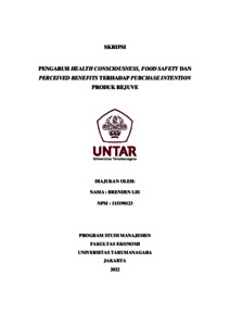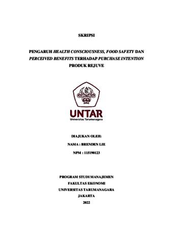Lie, Brenden (2022) PENGARUH HEALTH CONSCIOUSNESS, FOOD SAFETY DAN PERCEIVED BENEFITS TERHADAP PURCHASE INTENTION PRODUK REJUVE. Skripsi thesis, Universitas Tarumanagara.