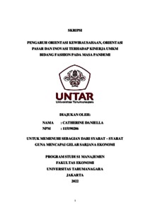 Daniella, Catherine (2022) PENGARUH ORIENTASI KEWIRAUSAHAAN, ORIENTASI PASAR DAN INOVASI TERHADAP KINERJA UMKM BIDANG FASHION PADA MASA PANDEMI. Skripsi thesis, Universitas Tarumanagara.