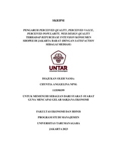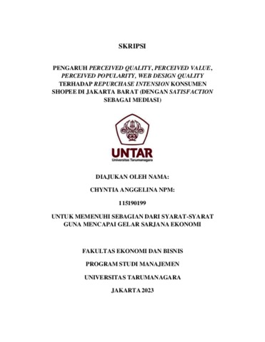Anggelina, Chyntia (2023) PENGARUH PERCEIVED QUALITY, PERCEIVED VALUE, PERCEIVED POPULARITY, WEB DESIGN QUALITY TERHADAP REPURCHASE INTENSION KONSUMEN SHOPEE DI JAKARTA BARAT (DENGAN SATISFACTION SEBAGAI MEDIASI). Skripsi thesis, Universitas Tarumanagara.
