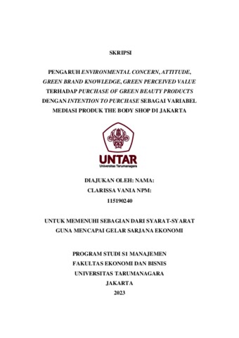 Vania, Clarissa (2023) PENGARUH ENVIRONMENTAL CONCERN, ATTITUDE, GREEN BRAND KNOWLEDGE, GREEN PERCEIVED VALUE TERHADAP PURCHASE OF GREEN BEAUTY PRODUCTS DENGAN INTENTION TO PURCHASE SEBAGAI VARIABEL MEDIASI PRODUK THE BODY SHOP DI JAKARTA. Skripsi thesis, Universitas Tarumanagara.