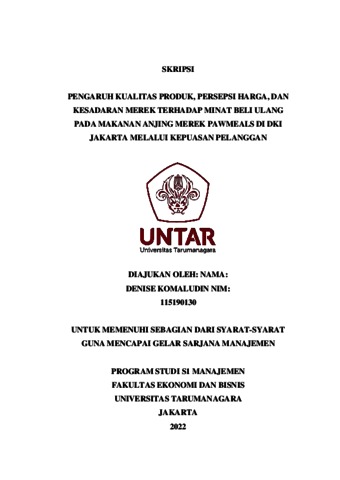 Komaludin, Denise (2022) PENGARUH KUALITAS PRODUK, PERSEPSI HARGA, DAN KESADARAN MEREK TERHADAP MINAT BELI ULANG PADA MAKANAN ANJING MEREK PAWMEALS DI DKI JAKARTA MELALUI KEPUASAN PELANGGAN. Skripsi thesis, Universitas Tarumanagara.