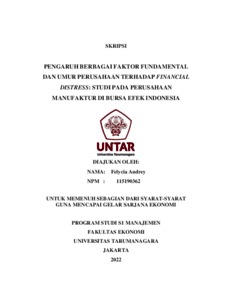 Audrey, Felycia (2022) PENGARUH BERBAGAI FAKTOR FUNDAMENTAL DAN UMUR PERUSAHAAN TERHADAP FINANCIAL DISTRESS: STUDI PADA PERUSAHAAN MANUFAKTUR DI BURSA EFEK INDONESIA. Skripsi thesis, Universitas Tarumanagara.