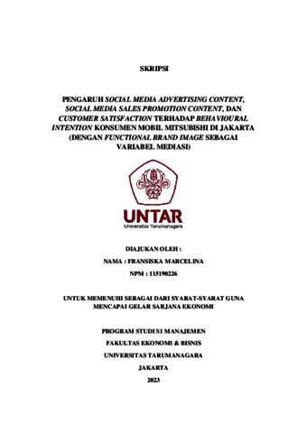 Marcelina, Fransiska (2023) PENGARUH SOCIAL MEDIA ADVERTISING CONTENT, SOCIAL MEDIA SALES PROMOTION CONTENT, DAN CUSTOMER SATISFACTION TERHADAP BEHAVIOURAL INTENTION KONSUMEN MOBIL MITSUBISHI DI JAKARTA (DENGAN FUNCTIONAL BRAND IMAGE SEBAGAI VARIABEL MEDIASI). Skripsi thesis, Universitas Tarumanagara.