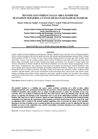 Timmy Setiawan Tjahja, Penulis Pertama and Fermanto Lianto, Penulis Kedua and Naniek Widayati Priyomarsono, Penulis Ketiga and Suwardana Winata, Penulis Keempat PENYESUAIAN PERENCANAAN AREA KOMPETISI DI STADION SEPAKBOLA UNTUK MENGATASI DAMPAK PANDEMI. PENYESUAIAN PERENCANAAN AREA KOMPETISI DI STADION SEPAKBOLA UNTUK MENGATASI DAMPAK PANDEMI.