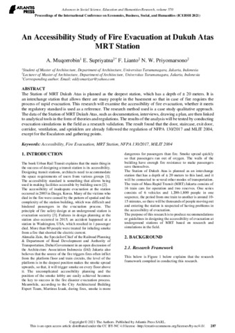 A. Muqorrobin, Penulis Pertama and E. Supriyatna, Penulis Kedua and F. Lianto, Penulis Ketigas and N. W. Priyomarsono, Penulis Keempat An Accessibility Study of Fire Evacuation at Dukuh Atas MRT Station. An Accessibility Study of Fire Evacuation at Dukuh Atas MRT Station.