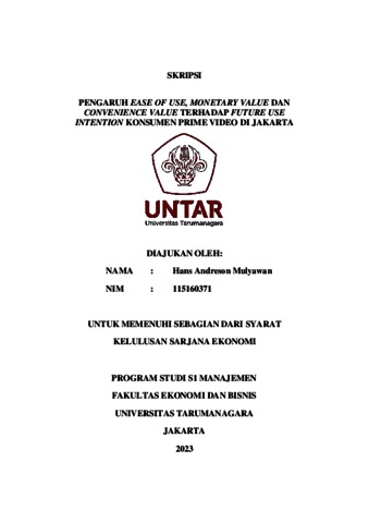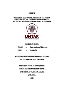 Andreson, Hans (2023) PENGARUH EASE OF USE, MONETARY VALUE DAN CONVENIENCE VALUE TERHADAP FUTURE USE INTENTION KONSUMEN PRIME VIDEO DI JAKARTA. Skripsi thesis, Universitas Tarumanagara.