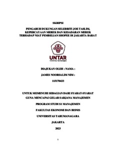 Noorsalim, James (2023) PENGARUH DUKUNGAN SELEBRITI JOE TASLIM, KEPERCAYAAN MEREK DAN KESADARAN MEREK TERHADAP NIAT PEMBELIAN SHOPEE DI JAKARTA BARAT. Skripsi thesis, Universitas Tarumanagara.