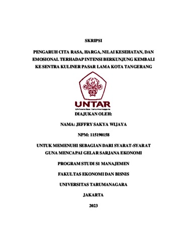 Sakya, Jeffry (2023) PENGARUH CITA RASA, HARGA, NILAI KESEHATAN, DAN EMOSIONAL TERHADAP INTENSI BERKUNJUNG KEMBALI KE SENTRA KULINER PASAR LAMA KOTA TANGERANG. Skripsi thesis, Universitas Tarumanagara.
