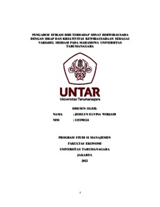 Elvina, Jesslyn (2022) PENGARUH EFIKASI DIRI TERHADAP MINAT BERWIRAUSAHA DENGAN SIKAP DAN KREATIVITAS KEWIRAUSAHAAN SEBAGAI VARIABEL MEDIASI PADA MAHASISWA UNIVERSITAS TARUMANAGARA. Skripsi thesis, Universitas Tarumanagara.