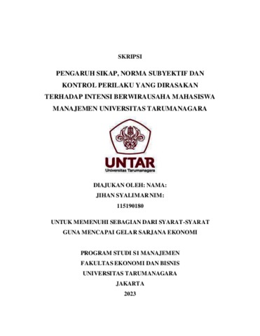 Syalimar, Jihan (2023) PENGARUH SIKAP, NORMA SUBYEKTIF DAN KONTROL PERILAKU YANG DIRASAKAN TERHADAP INTENSI BERWIRAUSAHA MAHASISWA MANAJEMEN UNIVERSITAS TARUMANAGARA. Skripsi thesis, Universitas Tarumanagara.