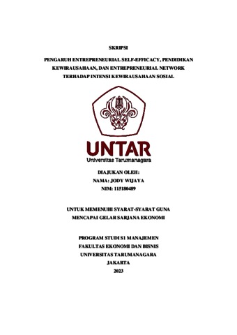 Wijaya, Jodi (2023) PENGARUH ENTREPRENEURIAL SELF-EFFICACY, PENDIDIKAN KEWIRAUSAHAAN, DAN ENTREPRENEURIAL NETWORK TERHADAP INTENSI KEWIRAUSAHAAN SOSIAL. Skripsi thesis, Universitas Tarumanagara.