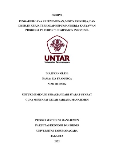 Fransisca, Lia (2022) PENGARUH GAYA KEPEMIMPINAN, MOTIVASI KERJA, DAN DISIPLIN KERJA TERHADAP KEPUASAN KERJA KARYAWAN PRODUKSI PT PERFECT COMPANION INDONESIA. Skripsi thesis, Universitas Tarumanagara.