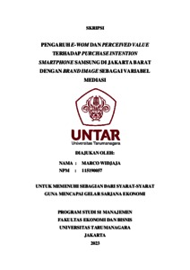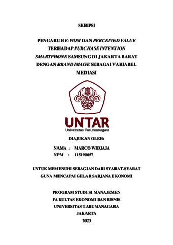 Widjaja, Marco (2023) PENGARUH E-WOM DAN PERCEIVED VALUE TERHADAP PURCHASE INTENTION SMARTPHONE SAMSUNG DI JAKARTA BARAT DENGAN BRAND IMAGE SEBAGAI VARIABEL MEDIASI. Skripsi thesis, Universitas Tarumanagara.