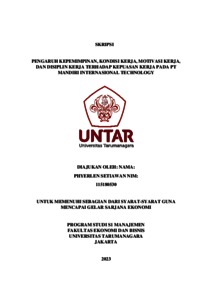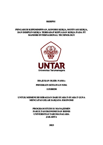 Setiawan, Phyerlen (2023) PENGARUH KEPEMIMPINAN, KONDISI KERJA, MOTIVASI KERJA, DAN DISIPLIN KERJA TERHADAP KEPUASAN KERJA PADA PT MANDIRI INTERNASIONAL TECHNOLOGY. Skripsi thesis, Universitas Tarumanagara.