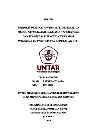 Winata, Rafaela (2023) PREDIKSI DESTINATION QUALITY, DESTINATION IMAGE, NATURAL AND CULTURAL ATTRACTIONS, DAN TOURIST SATISFACTION TERHADAP INTENTION TO VISIT WISATA KEPULAUAN RIAU. Skripsi thesis, Universitas Tarumanagara.