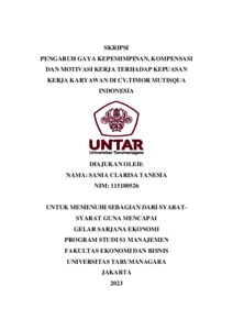 Clarisa, Sania (2023) PENGARUH GAYA KEPEMIMPINAN, KOMPENSASI DAN MOTIVASI KERJA TERHADAP KEPUASAN KERJA KARYAWAN DI CV.TIMOR MUTISQUA INDONESIA. Skripsi thesis, Universitas Tarumanagara.