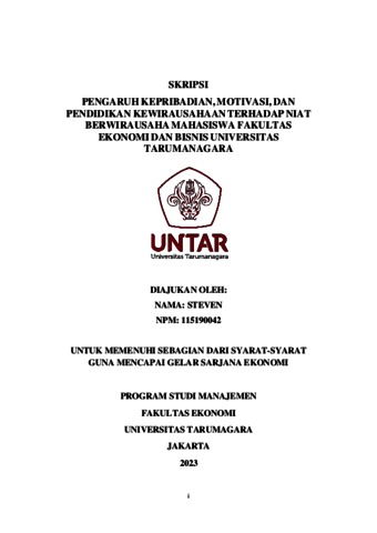 Steven, Steven (2023) PENGARUH KEPRIBADIAN, MOTIVASI, DAN PENDIDIKAN KEWIRAUSAHAAN TERHADAP NIAT BERWIRAUSAHA MAHASISWA FAKULTAS EKONOMI DAN BISNIS UNIVERSITAS TARUMANAGARA. Skripsi thesis, Universitas Tarumanagara.