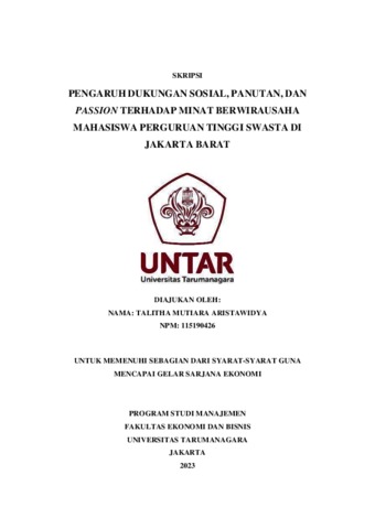 Mutiara, Talitha (2023) PENGARUH DUKUNGAN SOSIAL, PANUTAN, DAN PASSION TERHADAP MINAT BERWIRAUSAHA MAHASISWA PERGURUAN TINGGI SWASTA DI JAKARTA BARAT. Skripsi thesis, Universitas Tarumanagara.