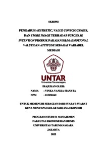 Vanlia, Vinka (2022) PENGARUH AESTHETIC, VALUE CONSCIOUSNESS, DAN STORE IMAGE TERHADAP PURCHASE INTENTION PRODUK PAKAIAN H&M: EMOTIONAL VALUE DAN ATTITUDE SEBAGAI VARIABEL MEDIASI. Skripsi thesis, Universitas Tarumanagara.