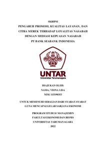 Lisa, Viona (2022) PENGARUH PROMOSI, KUALITAS LAYANAN, DAN CITRA MEREK TERHADAP LOYALITAS NASABAH DENGAN MEDIASI KEPUASAN NASABAH PT BANK SEABANK INDONESIA. Skripsi thesis, Universitas Tarumanagara.