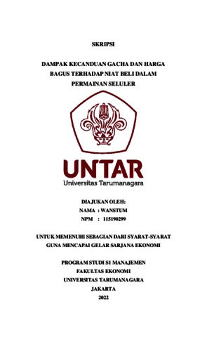 Wanstum, Wanstum (2022) DAMPAK KECANDUAN GACHA DAN HARGA BAGUS TERHADAP NIAT BELI DALAM PERMAINAN SELULER. Skripsi thesis, Universitas Tarumanagara.