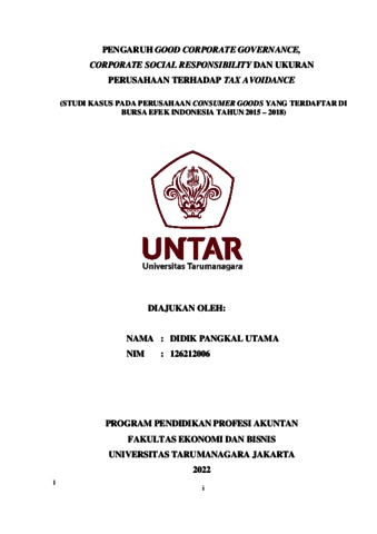 Pangkal Utama, Didik (2022) PENGARUH GOOD CORPORATE GOVERNANCE, CORPORATE SOCIAL RESPONSIBILITY DAN UKURAN PERUSAHAAN TERHADAP TAX AVOIDANCE. Masters thesis, Universitas Tarumanagara.