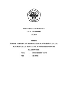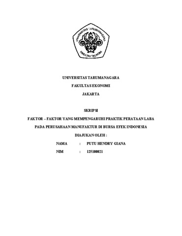 Giana, Putu Hendry (2014) FAKTOR – FAKTOR YANG MEMPENGARUHI PRAKTIK PERATAAN LABA PADA PERUSAHAAN MANUFAKTUR DI BURSA EFEK INDONESIA. Skripsi thesis, Universitas Tarumanagara.