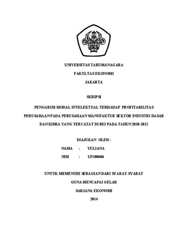 Yuliana, Yuliana (2014) PENGARUH MODAL INTELEKTUAL TERHADAP PROFITABILITAS PERUSAHAAN PADA PERUSAHAAN MANUFAKTUR SEKTOR INDUSTRI DASAR DAN KIMIA YANG TERCATAT DI BEI PADA TAHUN 2010-2012. Skripsi thesis, Universitas Tarumanagara.