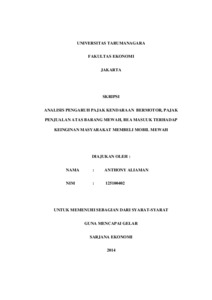 Aliaman, Anthony (2014) ANALISIS PENGARUH PAJAK KENDARAAN BERMOTOR, PAJAK PENJUALAN ATAS BARANG MEWAH, BEA MASUUK TERHADAP KEINGINAN MASYARAKAT MEMBELI MOBIL MEWAH. Skripsi thesis, Universitas Tarumanagara.