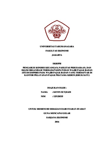 Sutiadi, Kevin (2016) PENGARUH KONDISI KEUANGAN, FASILITAS PERUSAHAAN DAN IKLIM ORGANISASI TERHADAP KEPATUHAN WAJIB PAJAK BADAN (STUDI EMPIRIS PADA WAJIB PAJAK BADAN YANG TERDAFTAR DI KANTOR PELAYANAN PAJAK PRATAMA KEBON JERUK SATU). Skripsi thesis, Universitas Tarumanagara.