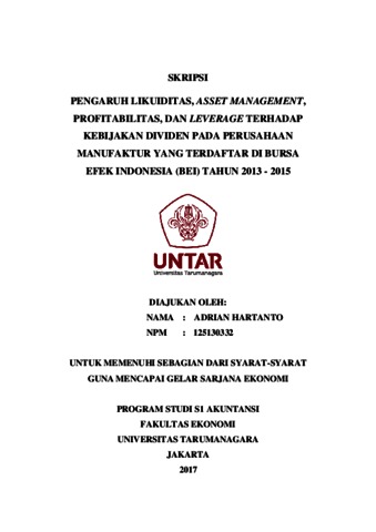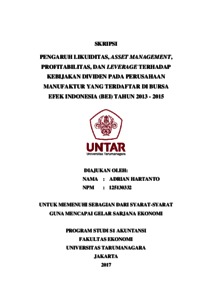 Hartanto, Adrian (2017) PENGARUH LIKUIDITAS, ASSET MANAGEMENT, PROFITABILITAS, DAN LEVERAGE TERHADAP KEBIJAKAN DIVIDEN PADA PERUSAHAAN MANUFAKTUR YANG TERDAFTAR DI BURSA EFEK INDONESIA (BEI) TAHUN 2013 - 2015. Skripsi thesis, Universitas Tarumanagara.