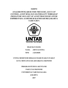 Gustina, Devi (2017) ANALISIS PENGARUH TIME PRESSURE, LOCUS OF CONTROL, AUDIT RISK, DAN MATERIALITY TERHADAP PREMATURE SIGN-OFF OF AUDIT PROCEDURE (STUDI EMPIRIS PADA AUDITOR DI KAP BESAR DKI JAKARTA TAHUN 2017). Skripsi thesis, Universitas Tarumanagara.
