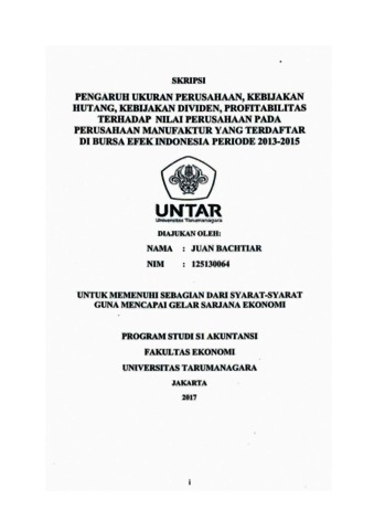 Bachtiar, Juan (2017) PENGARUH UKURAN PERUSAHAAN, KEBIJAKAN HUTANG, KEBIJAKAN DIVIDEN, DAN PROFITABILITAS TERHADAP NILAI PERUSAHAAN PADA PERUSAHAAN MANUFAKTUR YANG TERDAFTAR DI BEI PADA PERIODE 2013-2015. Skripsi thesis, Universitas Tarumanagara.