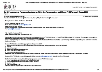 4. Email Tarumanagara University - Fwd_ Pengumuman Pengumpulan Laporan Akhir dan Penyampaian Hasil Monev PKM Periode II Tahun 2022.pdf Download (115kB) | Preview |