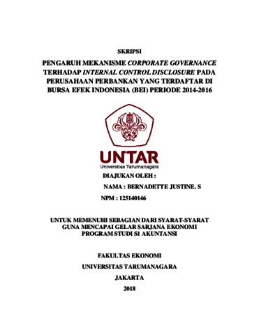 Justine S, Bernadette (2018) PENGARUH MEKANISME CORPORATE GOVERNANCE TERHADAP INTERNAL CONTROL DISCLOSURE PADA PERUSAHAAN PERBANKAN YANG TERDAFTAR DI BURSA EFEK INDONESIA (BEI) PERIODE 2014-2016. Skripsi thesis, Universitas Tarumanagara.