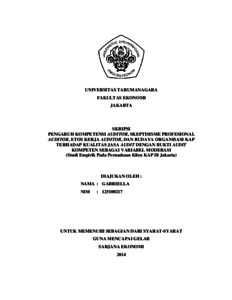 Gabriella, Gabriella (2014) PENGARUH KOMPETENSI AUDITOR, SKEPTISISME PROFESIONAL AUDITOR, ETOS KERJA AUDITOR, DAN BUDAYA ORGANISASI KAP TERHADAP KUALITAS JASA AUDIT DENGAN BUKTI AUDIT KOMPETEN SEBAGAI VARIABEL MODERASI (Studi Empirik Pada Perusahaan Klien KAP Di Jakarta). Skripsi thesis, Universitas Tarumanagara.