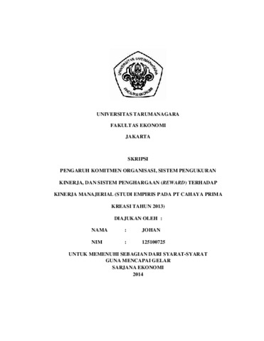 Johan, Johan (2014) PENGARGUH KOMITMEN ORGANISASI, SISTEM PENGUKURAN KINERJA, DAN SISTEM PENGHARGAAN (REWARD) TERHADAP KINERJA MANAJERIAL (STUDI EMPIRIS PADA PT CAHAYA PRIMA KREASI TAHUN 2013). Skripsi thesis, Universitas Tarumanagara.